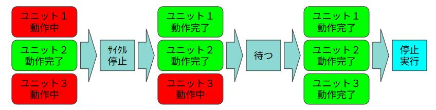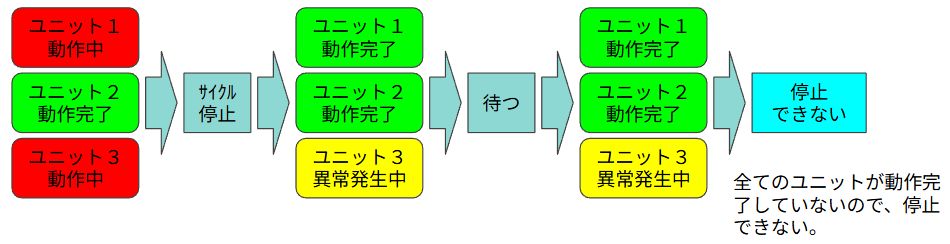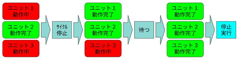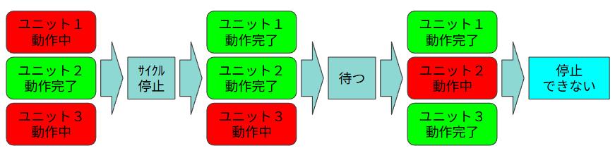 そこでサイクル停止状態になると、各ユニットに再起動できないようにロックしておく必要があります。ロックすることで全てのユニットが動作完了になり再起動しなくなります。このように停止するタイミングは自分で作ります。