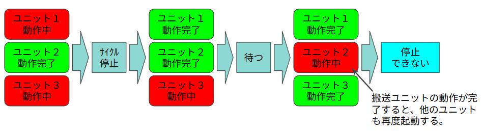 設備の内容にもよりますが、例えば搬送ユニットが組み込まれた設備の場合、作業ユニットの動作が完了すると搬送ユニットが搬送開始するのでいつまでも停止できません。搬送ユニットは下のユニット2のようになります。