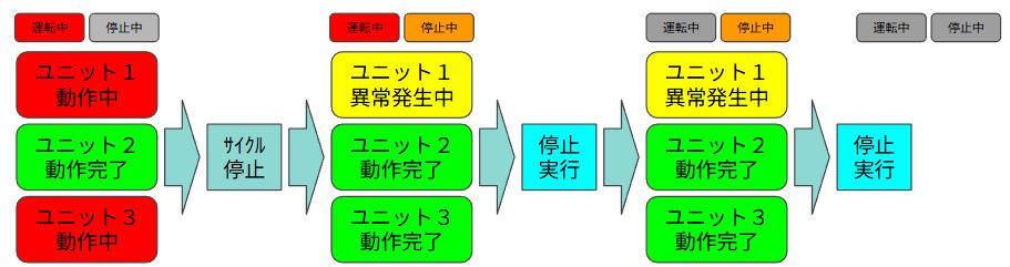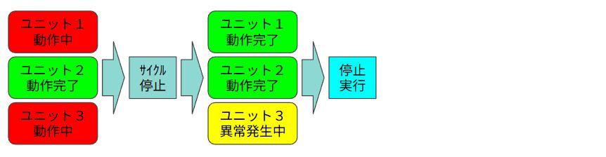 そのためサイクル停止実行の条件を「全てのユニットが動作完了か異常発生中」にする。こうすることで異常ユニットは無視して正常なユニットだけはサイクル停止させることができます。