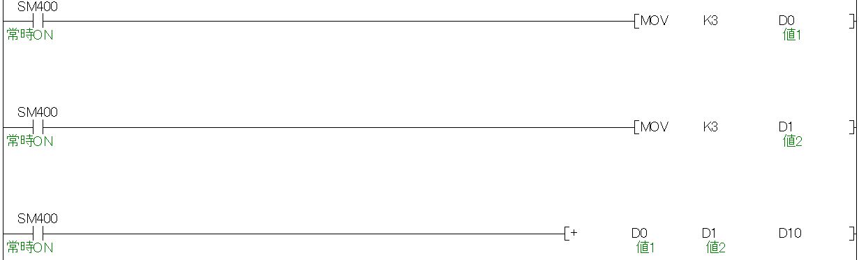 このような足し算命令があるとします。これは「D0」と「D1」の値を足して「D10」に出力します。答えは"6"になります。