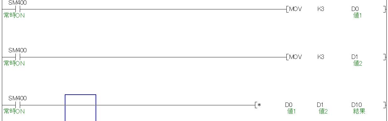 計算結果を「D10」に出力していますが、「D10」と「D11」が使われていることが分かります。これはシングルワード(16ビット)での掛け算の計算結果はダブルワード(32ビット)で出力されるためです。三菱や多くのPLCの場合、このような仕様になっています。掛け算をダブルワード(32ビット)で行うと、出力は64ビットで出力されます。