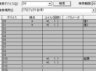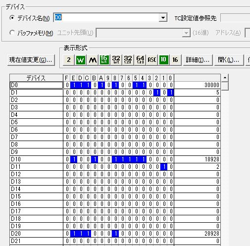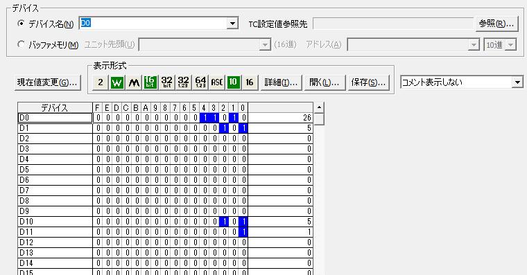 この時使用デバイスを見ても「D0」と「D1」、「D10」を使用しています。それぞれシングルワード(16ビット)で使用しています。