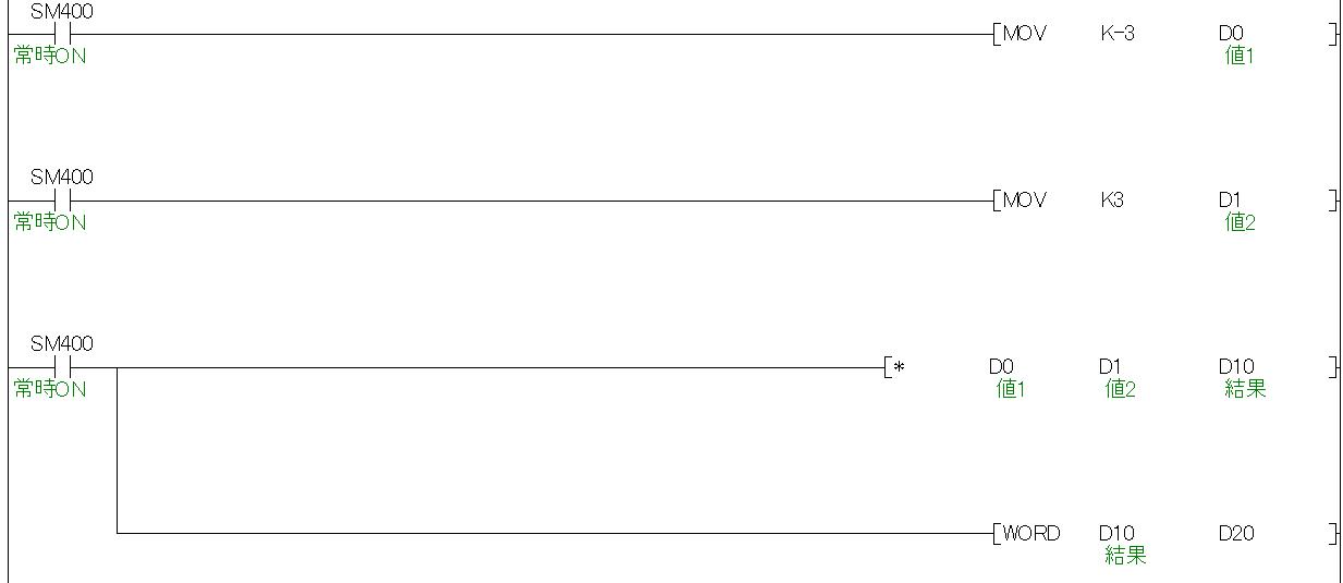 このように命令によっては出力結果がダブルワードで出力されるものもあるので、符号の入れ替えがあるのであればそのまま32ビットで使うか、[WORD]命令などで16ビットに変換して使用してください。