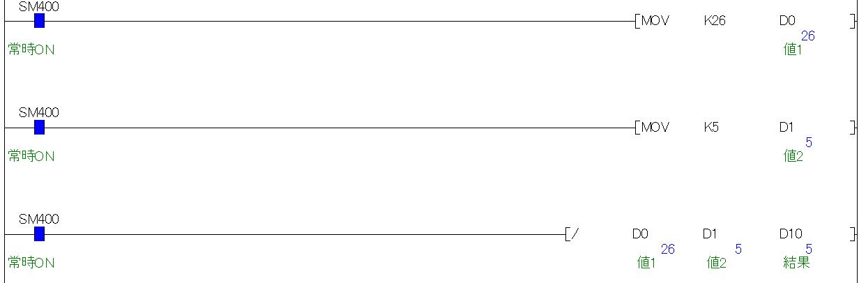 「D10」には商の”5”。「D11」には余りの”1”が出力されます。全体として割り算の出力もダブルワード(32ビット)になります。