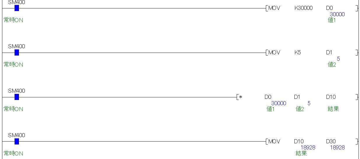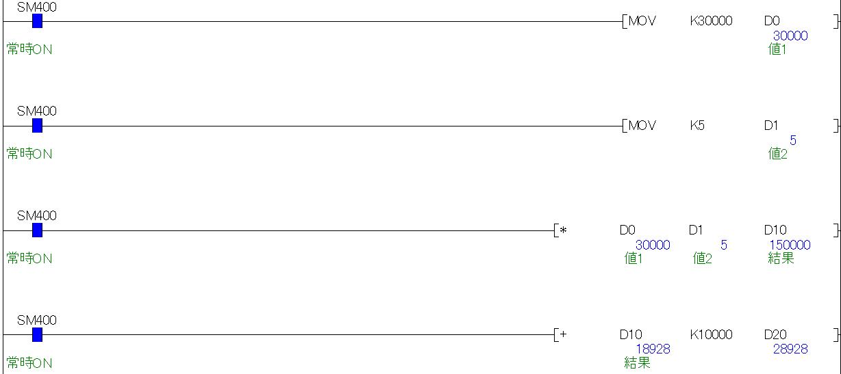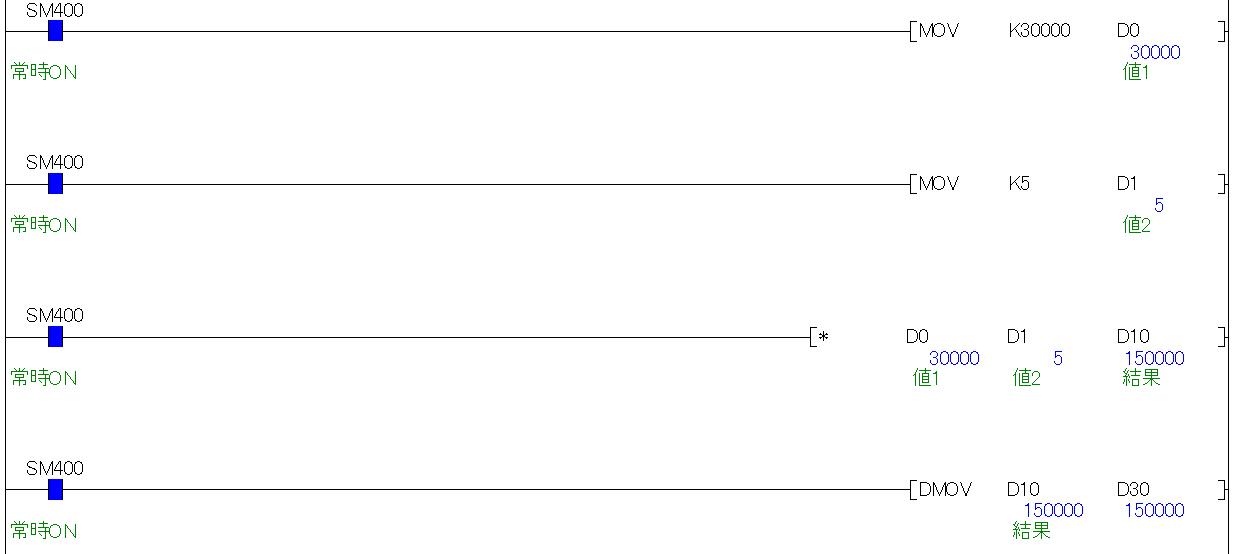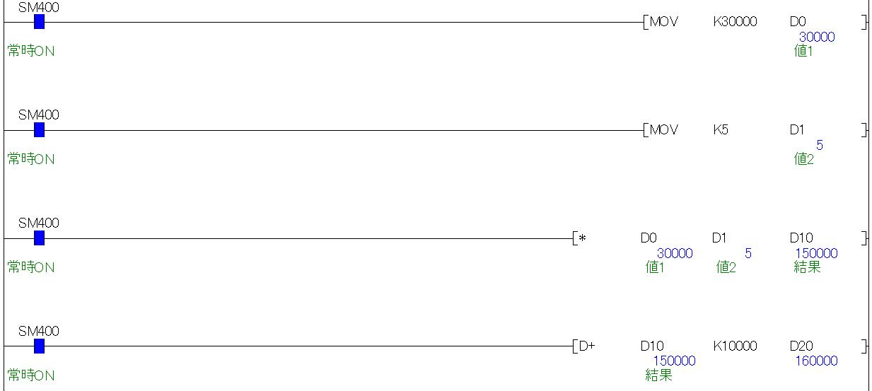 このように命令の先頭に「D」をつけると、扱うデータをダブルワード(32ビット)で指定できます。「D30」にはちゃんと計算結果の"150000"がダブルワードで出力されます。