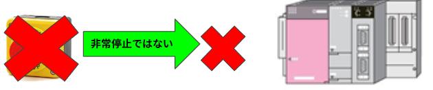 もし非常停止ボタンが壊れたら非常停止ボタンはOFFの状態で壊れる可能性が高いです。非常停止ボタンを取り外した場合も同じです。この場合もし設備に異常があり非常停止させたいとき、非常停止ボタンを押しても設備は停止しません。また、取り外された場合は押すことすらできません。しかもPLCは非常停止信号が入ってこないので、非常停止ボタンが壊れても設備は正常に動きます。大変危険です。